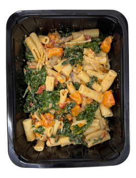 Een energieke salade met kale, geroosterde pompoen, macaroni, champignons en gekonfijte tomaten, op smaak gebracht met een mosterd–agavesiroopdressing. Biologisch, vegan en kleurrijk.