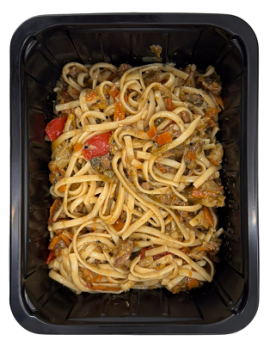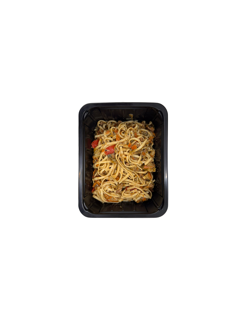 Een warme en evenwichtige maaltijd met linguine, kip, Chinese kool, wortelen en broccoli, afgewerkt met een huisgemaakte teriyakisaus met tamari, gember en zwarte sesam. Een smakelijke reis naar Azië.