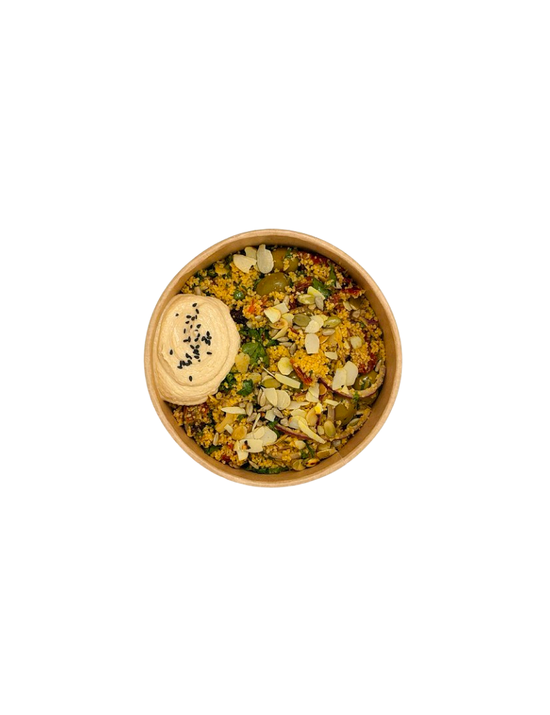 Frisse salade geïnspireerd op tabouleh, met couscous, hummus, zongedroogde tomaten, amandelen en zaden. Een aromatische combinatie met frisse citrustoetsen