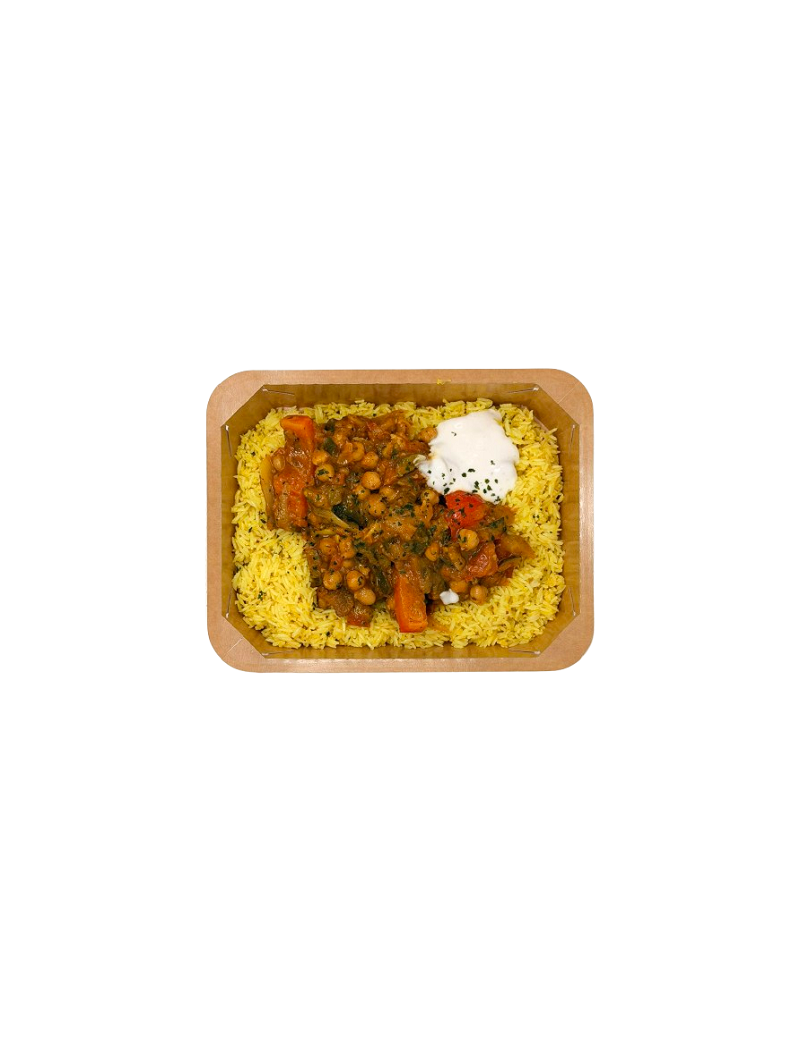 Vegan gerecht met rijst, kikkererwten en mediterrane groenten, gekruid met komijn, kurkuma en koriander. Een aromatisch en voedzaam gerecht.