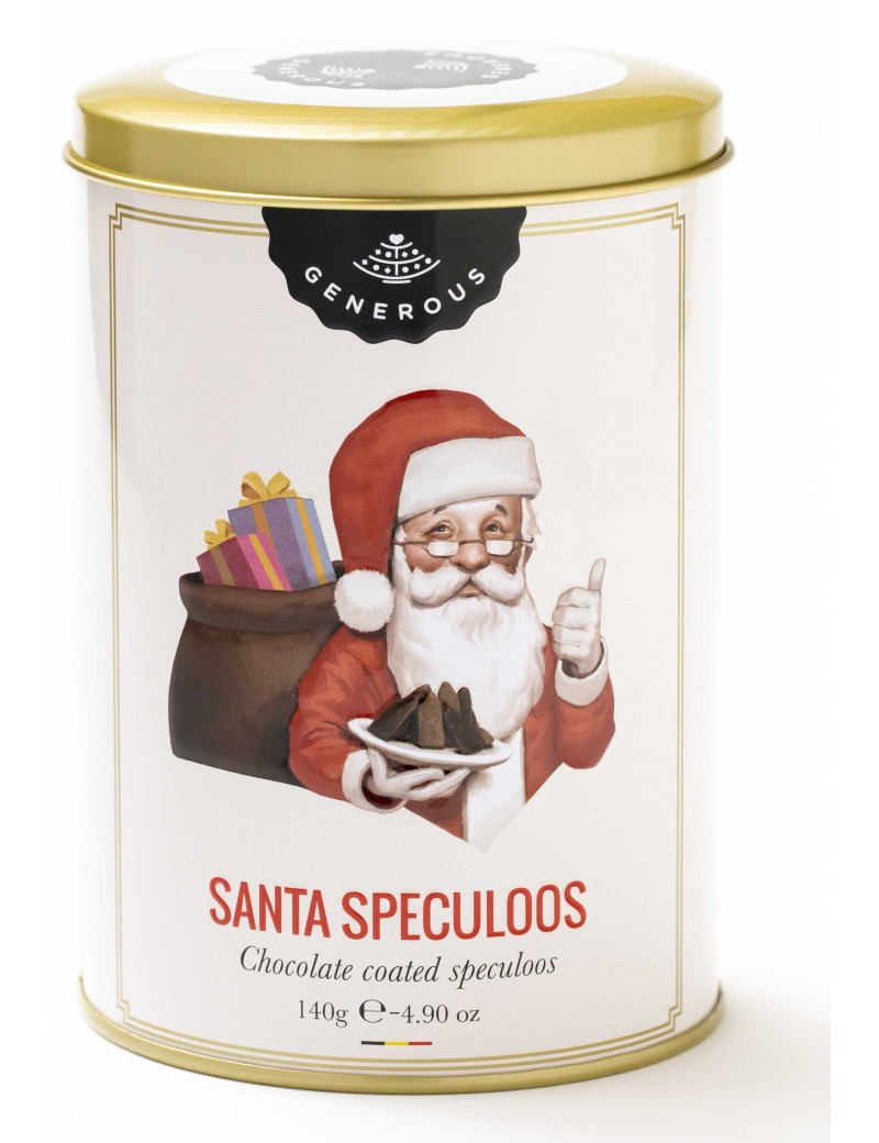 Glutenvrije Santa Speculoos met donkere choclade in een mooi metalen doosje.
