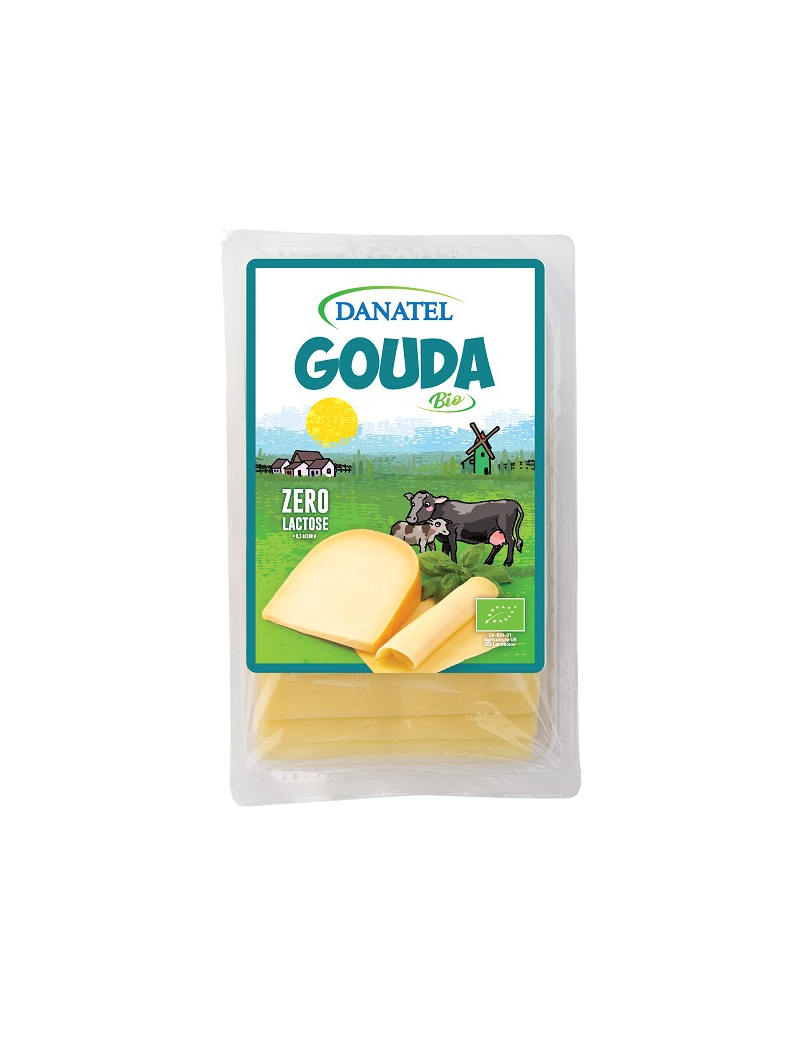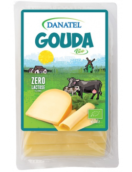 Deze biologische, lactosevrije Gouda, gemaakt van melk van koeien die op biologische boerderijen worden gehouden, heeft een zeer milde smaak en is vooral populair in sandwiches of croque-monsieurs.