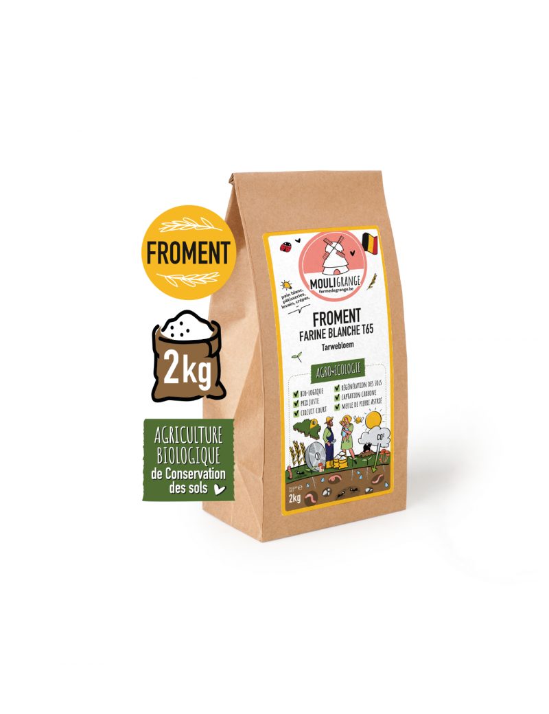 MouliGrange meel wordt gemalen in Ferme de Grange in Anhée s/Meuse door Guirec de Wouters en Jean-François Wartique.De granen zijn allemaal biologisch geteeld voor bodembehoud (ABC). Ferme de Grange produceert de meeste en wordt erkend als pionier in deze agro-ecologische beweging. De andere boeren (altijd vermeld op de verpakkingen) zijn ook allemaal lid van de Belgische coöperatie Farm For Good, die de agro-ecologische boerderijen in haar netwerk streng controleert (ABC).De granen worden gemalen op een Astriée stenen molensteen om de voedingswaarde van het graan te behouden.De familie de Wouters wil graag haar werk in de regeneratieve landbouw delen en de deugden ervan sublimeren in een eindproduct van hoge smaak en voedingskwaliteit!De boerderij staat altijd open voor wie dit weinig bekende deugdzame werk wil ontdekken.