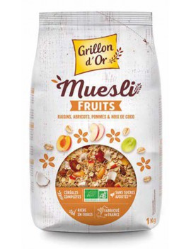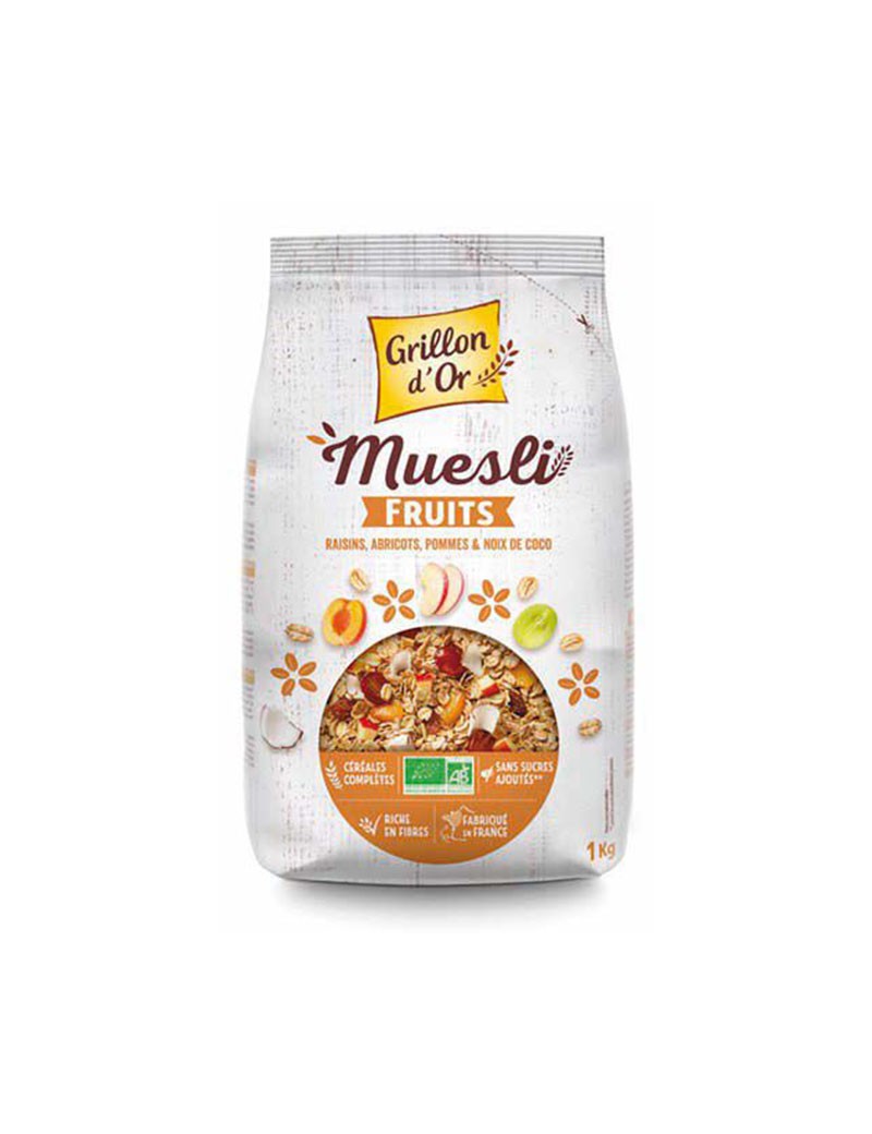 Mengeling van krokante granen met vruchten afkomstig van biologische landbouw. Te gebruiken met melk, een plantaardige drank of met platte kaas.