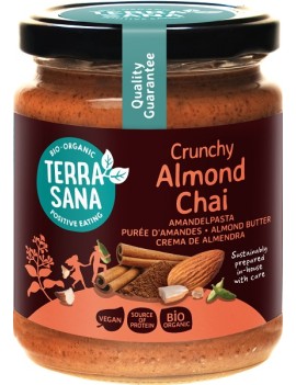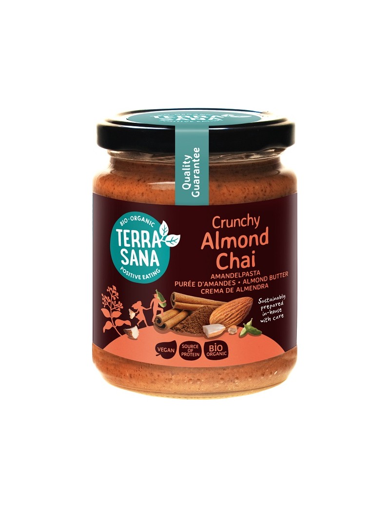 Deze volle amandelpasta crunchy chai heeft een verrukkelijke en pure amandelsmaak. Heerlijk op je boterham, cracker of rijstwafel met als leuke verrassing een schijfje komkommer.