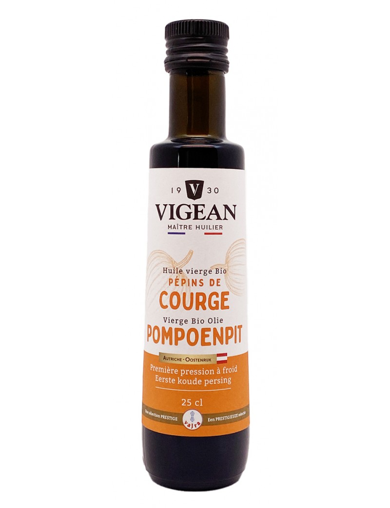 De aangename smaak van pompoenpittenolie is zeer gewaardeerd. Kenmerkt zich door zijn rijkdom aan omega 6 (51%), een lager gehalte aan omega 3 en zijn evenwicht aan verzadigde en onverzadigde vetzuren. Bestrijdt tandbederf en spijsverteringsparasieten en stimuleert kalkvorming. Voor koud gebruik, niet verhitten.