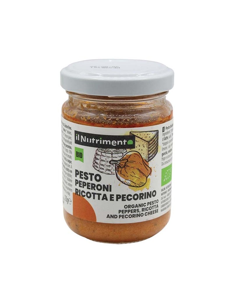 Paprika 26%, extra virgin olijfolie, ricotta 10% (wei, zout), cashewnoten, ui, tomatenpulp, gedroogde tomates, dubbel tomatenconcentraat, kaas Pecorino 3.2%, citroensap, zeezout, basilicum, oregano