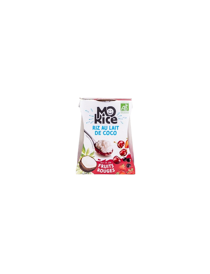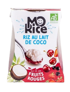 Fairtrade kokosmelk, rode vruchtenbereiding (zwarte bessenpuree, water, fairtrade rietsuiker, kersenpuree, aardbeienpuree, maniokzetmeel, geconcentreerd citroensap, geconcentreerd vlierbessensap), water, ronde Camargue rijst, fairtrade rietsuiker, rijstzetmeel
