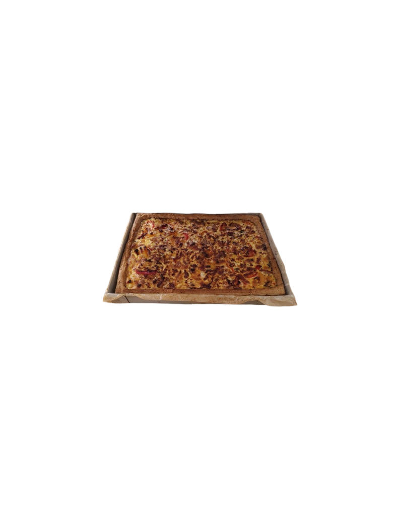 Een heerlijke ambachtelijke hartige taart met de zachte smaak van geroosterde paprika’s en de volle toets van gerookt spek, verrijkt met room en verse eieren. Reeds gebakken, eenvoudig op te warmen in de oven of microgolf voor een goudbruin en smeuïg resultaat.