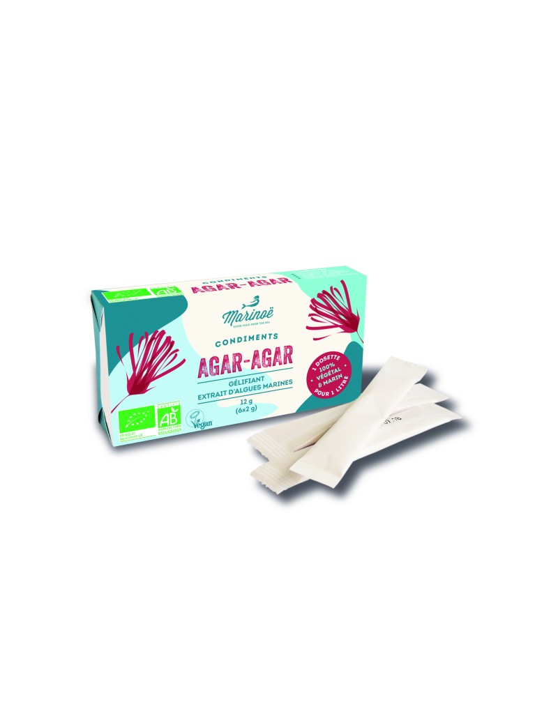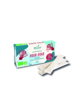 Gelatinepoeder van rode algen. In Japan wordt het Kanten genoemd. Vervangt zeer goed de gelatines van dierlijke oorsprong. Zonder smaak of kleur, rijk aan ijzer, is opgesteven na slechts enkele minuten. Ideaal voor het gelatineren van fruit of het verstevigen van een vegetarische paté.