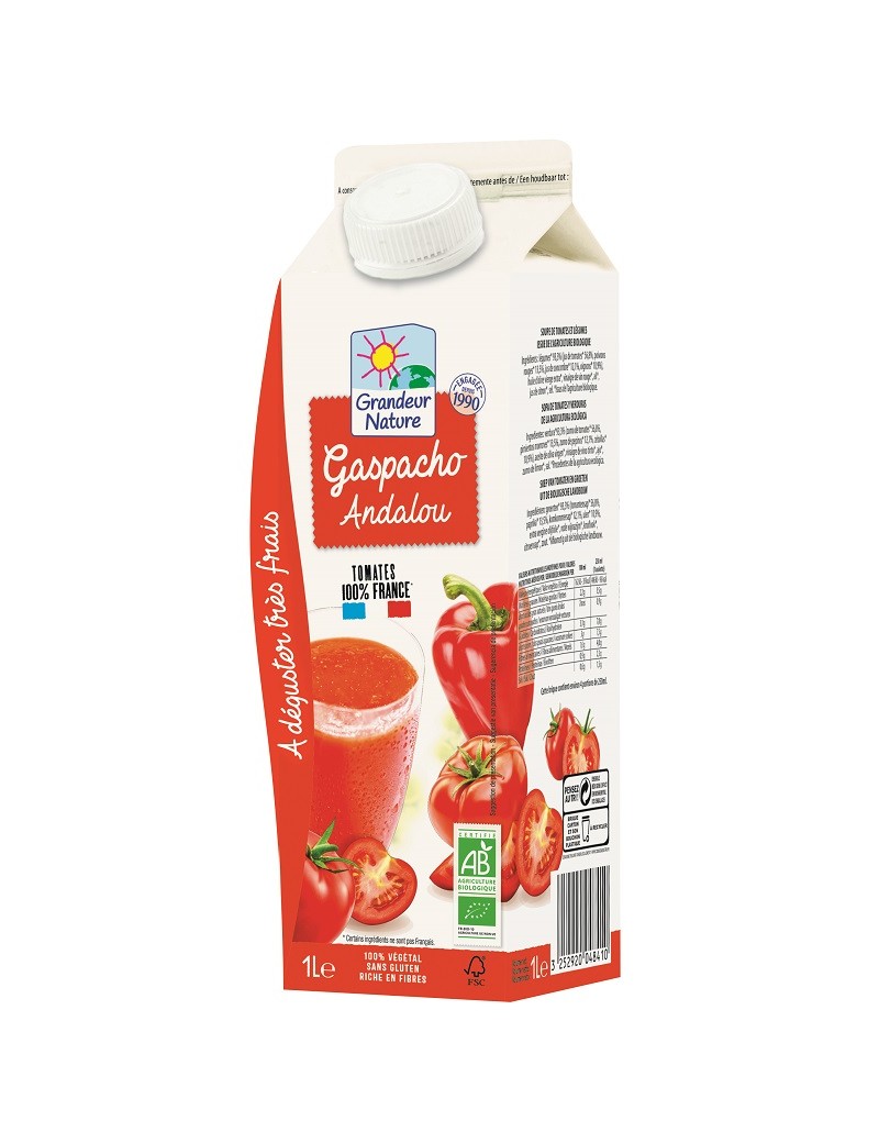 Gaspacho wordt het best koud geserveerd (of zelfs met ijs) op warme zomerdagen. Dit recept, gemaakt met 100% Franse tomaten, is gegarandeerd glutenvrij en rijk aan vezels. Gemaakt met zonovergoten zomergroenten is deze koude soep zowel licht als verfrissend. Je kunt er op elk moment van de dag van genieten, als aperitief of als voorgerecht. Voor nog meer smaak raden we aan om hem te serveren met croutons, crème fraîche en/of olijfolie. Deze brick wordt geleverd met een hersluitbare dop voor extra gemak.