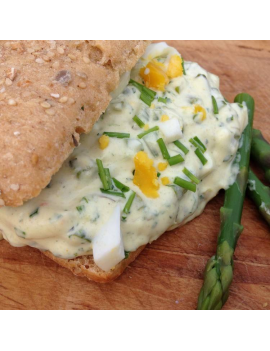 Salade d'asperges, dans une béchamel (contient de la farine d'épeautre) et aux herbes fraiches. Un délice pendant la saison. Disponible en 500 g ou en 1 kg. Vers en Veggie prépare des tartinables, des quiches et des plats préparés végétaliens à base de légumes et d'herbes aromatiques bio, cultivés par les agriculteurs de la région.