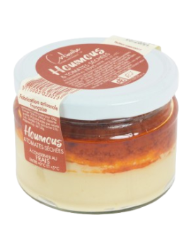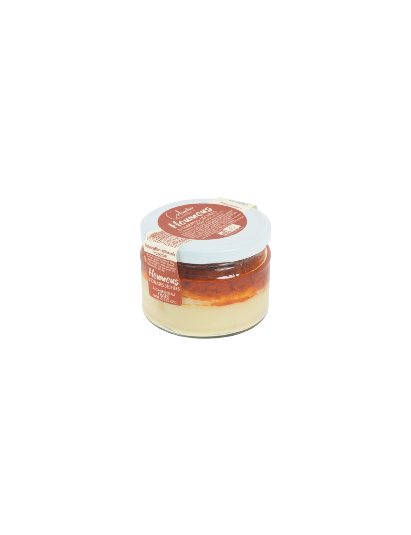 Kikkererwten, zonnebloemolie, citroensap, geroosterde en gemalen zonnebloempitpasta, gerehydrateerde gedroogde tomaten, tomatenpuree, water, zout, suiker, natriumbicarbonaat (toegevoegd aan het kikkererwtenkookwater om de zuurgraad te reguleren)