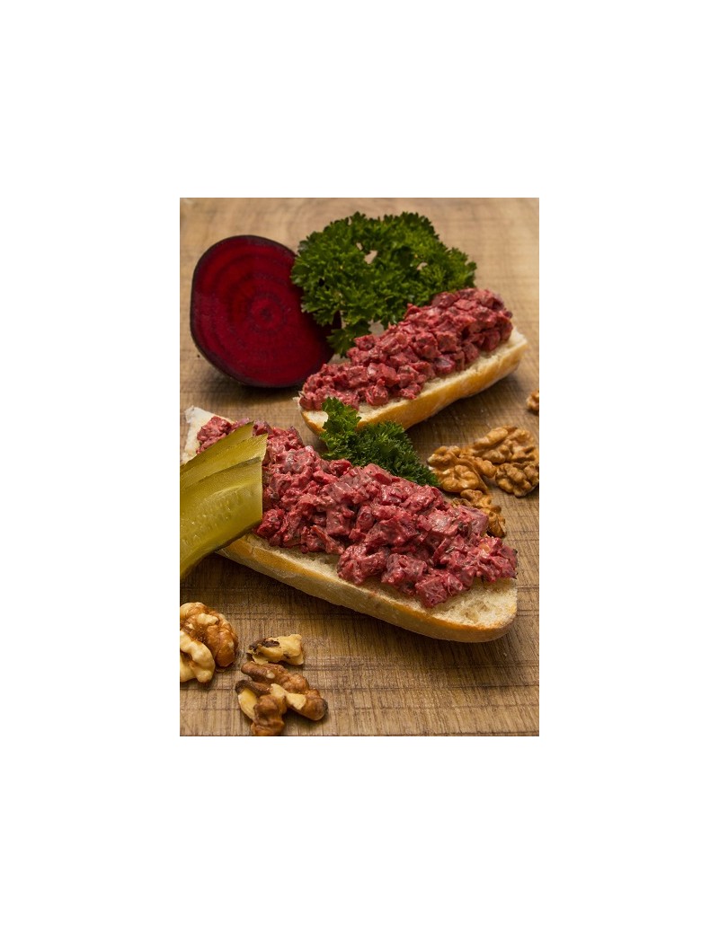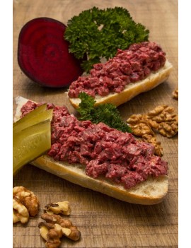 Salade de betteraves rouges cuites à la vapeur, enrichie avec des noix grillées, câpres, persil… Sans gluten. Disponible en 500 g ou en 1 kg. Vers en Veggie prépare des tartinables, des quiches et des plats préparés végétaliens à base de légumes et d'herbes aromatiques bio, cultivés par les agriculteurs de la région.
