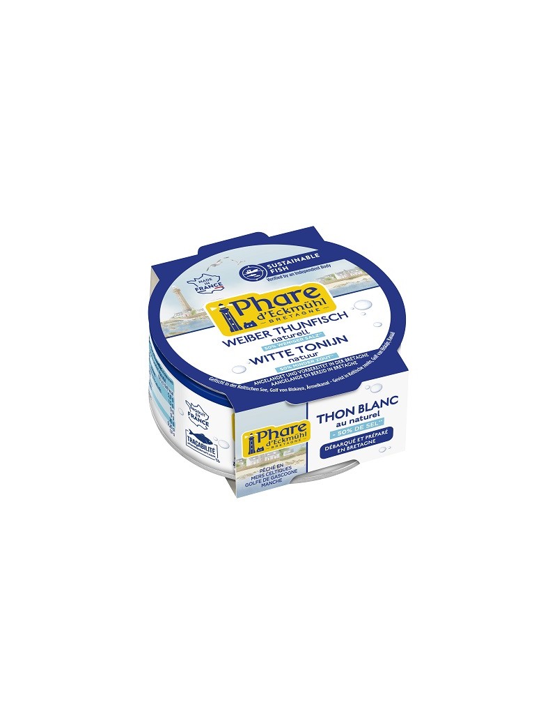 Deze witte tonijn, op natuurlijke wijze bereid in Douarnenez in Bretagne, wordt op verantwoorde wijze gevangen in de Keltische Zee, de Golf van Biskaje en het Kanaal. Hij bevat 50% minder zout dan de gemiddelde tonijn in blik op de markt. Witte tonijn is de enige tonijn die rijk is aan omega 3.